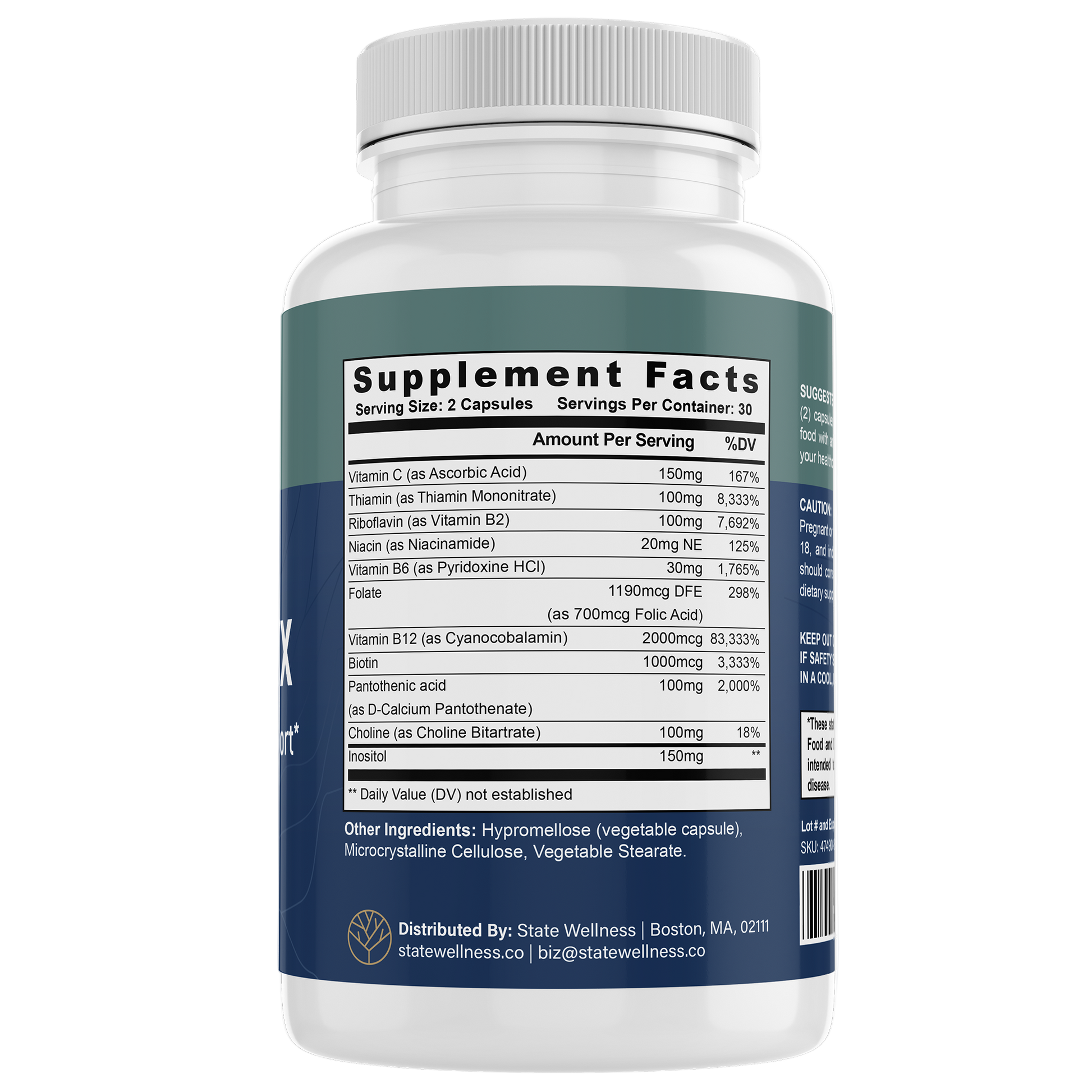 - 2000 mcg Vitamin B12 (Cyanocobalamin), 100 mg Choline, 150 mg Inositol